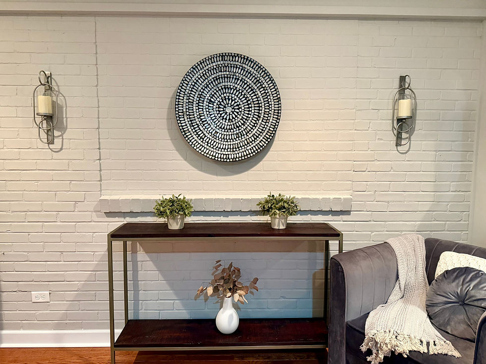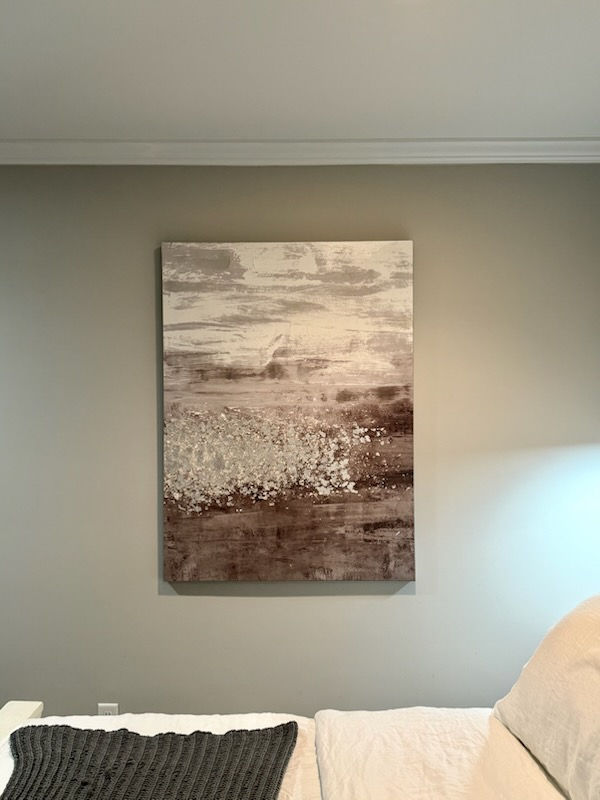 Now, back to the kitchen windows! So the new Primary Bedroom was built behind the kitchen. We left the windows in on purpose just because structurally it was easier to leave them in and cover them up and keep as much of the brick intact. I had a plan for the kitchen side. On the bedroom side I bought some of that fake brick paneling that looks like it’s made from really thick cardboard. I had someone throw it up there to cover the old hole where the windows were and then I painted it to match the brick around it. It’s not perfect, but it looks pretty neat and adds interest to that wall as we left the old brick window ledge so you can tell something used to be there. Then it came time to figure out what to put up there…Originally, in our plans, we had talked about putting one of those fake wall mounted fireplaces up there, to add some cozy to the room. That plan kind of went by the wayside, when I found a really neat round giant “dish” to hang up there. It was lightweight (so much easier to hang), so I felt confident that it was a good choice and it was really pretty, and the colors matched the giant abstract picture hanging on the wall directly across from it! Speaking of the giant picture on the other wall….it’s massive!!! That picture kind of set the stage for the room….well, maybe let’s say for the color scheme of the room…The bed was really the original inspiration of this room! Now typically, my color schemes and room decor all center around back. Black light fixtures, black or dark fans, black everything! So, I was trying to be a little different this time around and went for silver! That’s where the giant picture swayed me and pulled me. I really do love it! To me it looks like a glittery sparkly ocean wave. Relaxing and beautiful, but abstract. Did you notice that sparkle is also one of the focal points of the home page on my website? Cool eh?! Inspiration comes from everywhere!